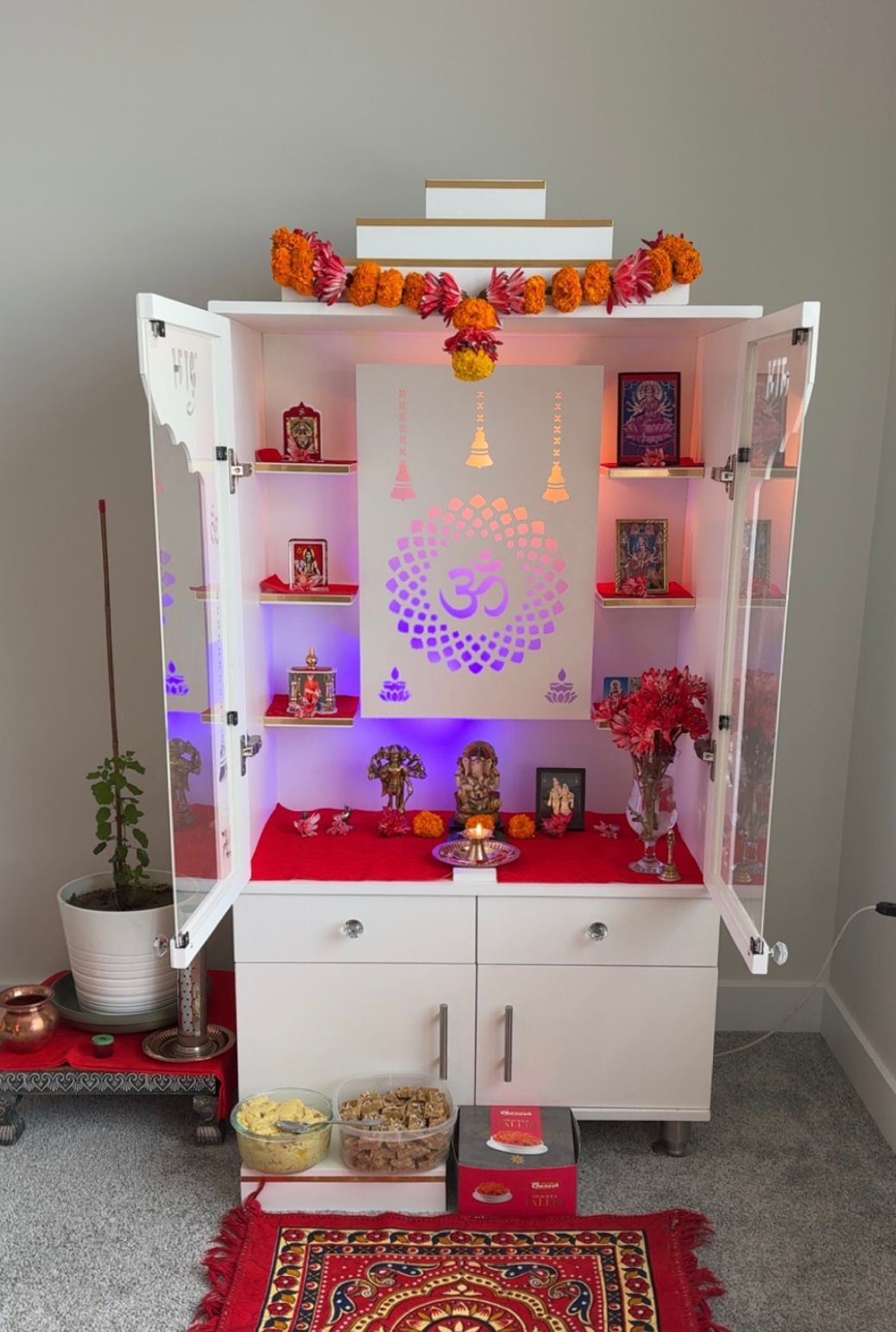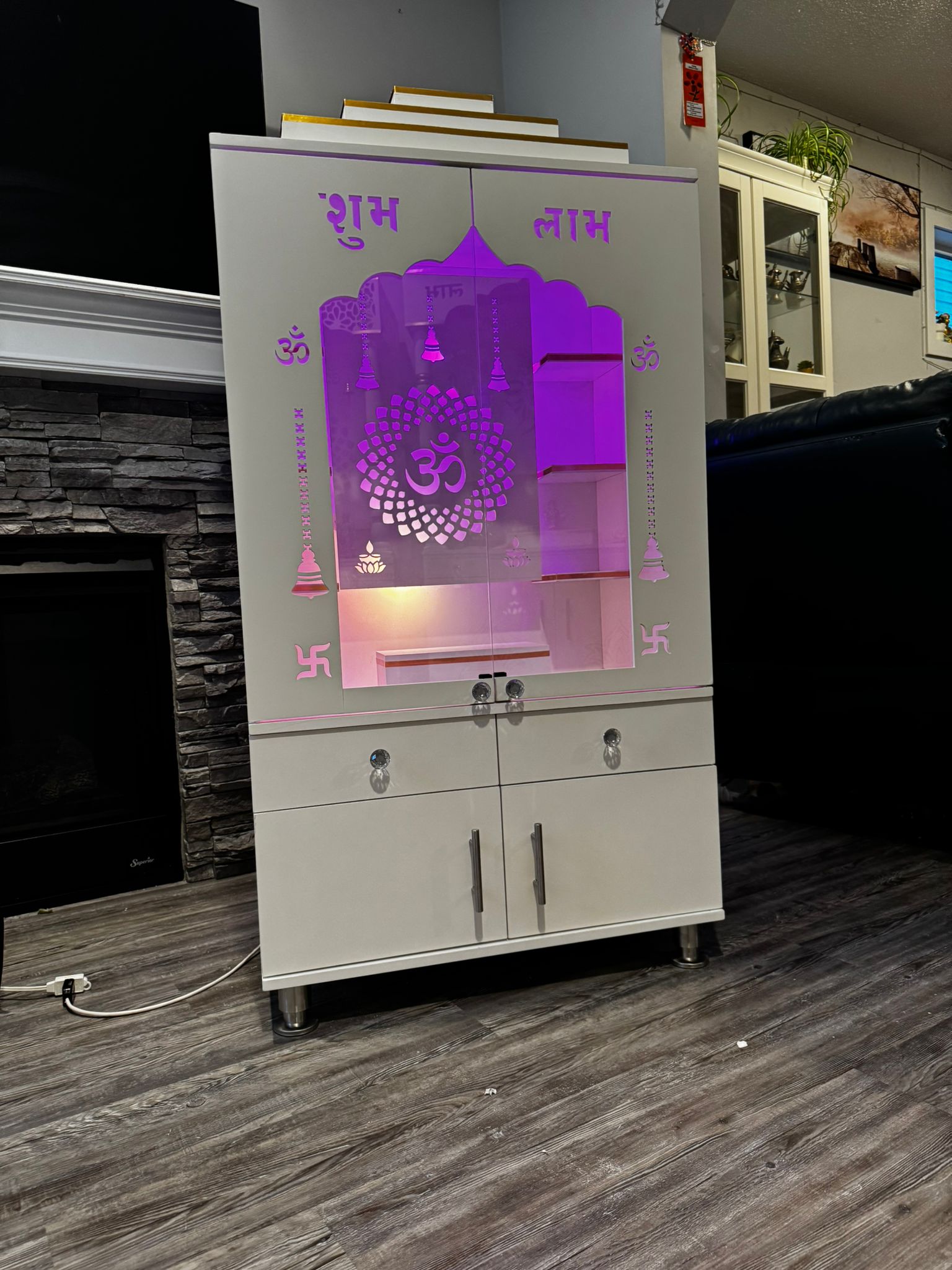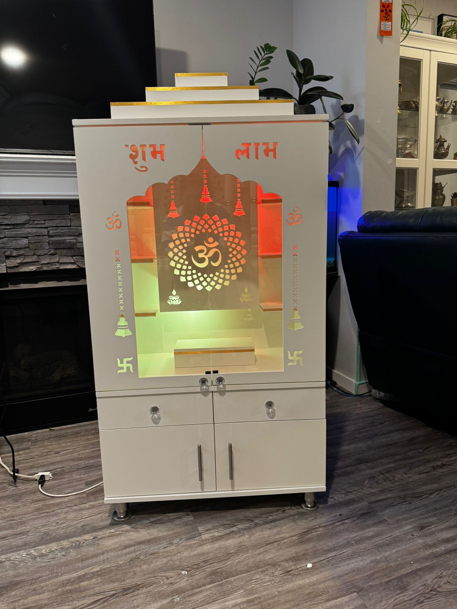 Temple with acrylic door, Om at center, 2 drawers, 1 cabinet, temple-style top, and 6 shelves for idols.